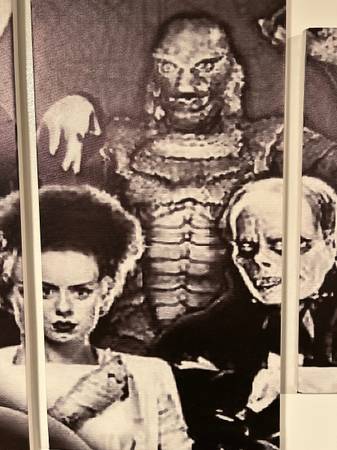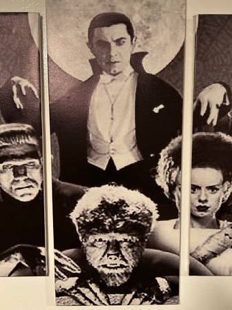 This stretched canvas set features Dracula, Frankenstein, The Wolfman, Bride of Frankenstein, The Invisible Man, The Phantom of the Opera, and The Creature from the Black Lagoon.