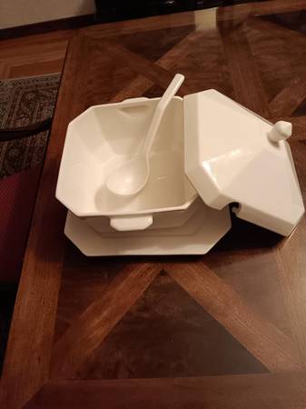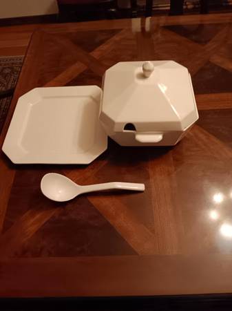 A beautiful, well-made white ceramic tureen with a spoon and plate. 9lbs. Height- 9". Width 12". Plate 12" x 12"( Handle to Handle.) Excellent condition with tiny chip on cover having no effect on tureen's efficacy. Similar tureens without plate- $50.00 and up.