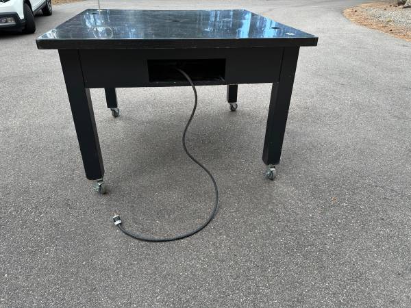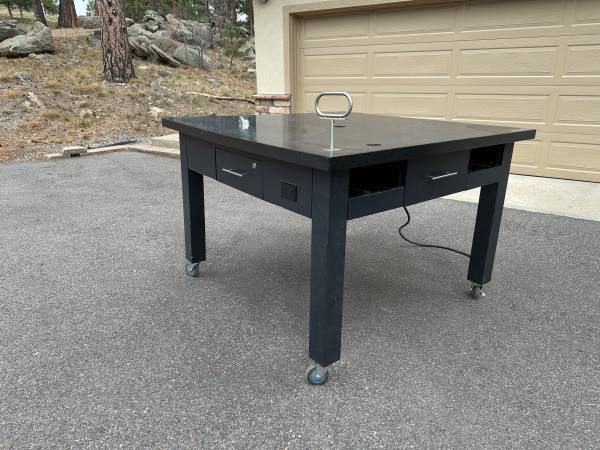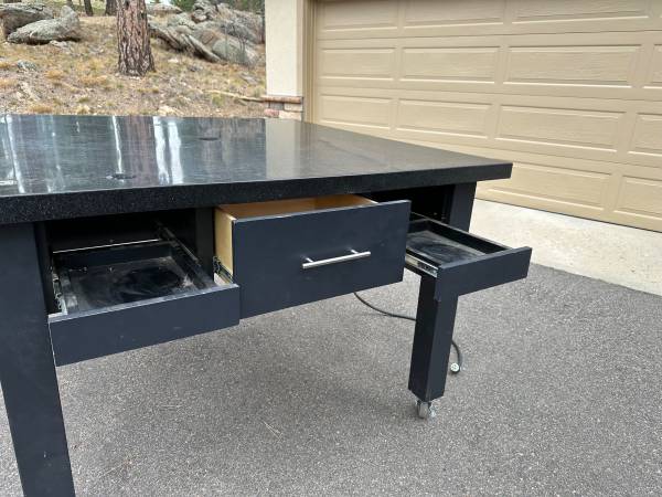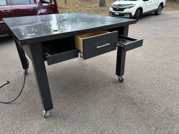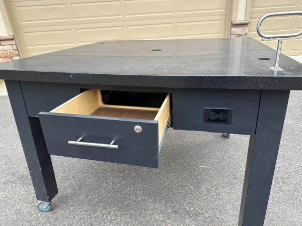 Work table. 60" x 60" x 41.5" high. Seven drawers. Wired electric outlets. Large wheels on legs. Professionally made table with 1/2" thick Corian-type top. Quality finishes.
