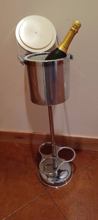 Champagne Cooler Bucket on Stand. Set yourself apart with this unique, usable decorating accessory. Guaranteed your friends and neighbors don't have one! Chrome outside with insulated bucket....