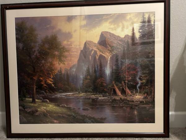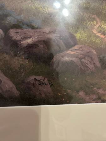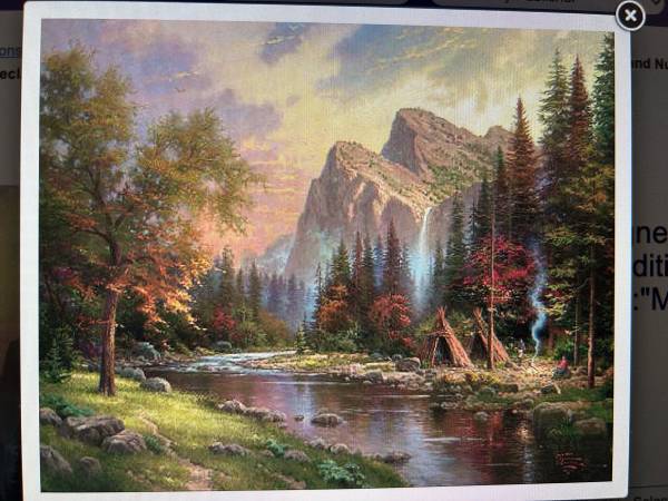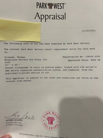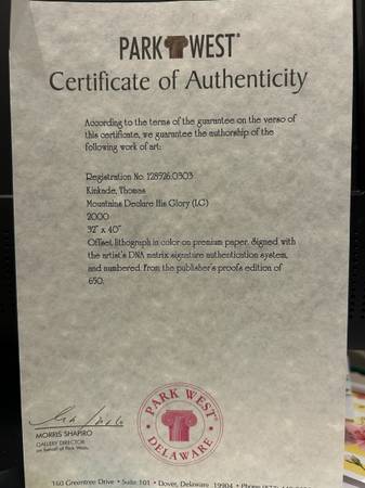 This limited edition high quality lithograph by renowned artist Thomas Kinkade, titled "Mountains Declare His Glory", is a stunning addition to any art collection. This picture is numbered 126 out of 650 from the publisher’s proofs edition. Signed with the artist’s DNA matrix signature, the print comes with a Certificate of Authenticity.