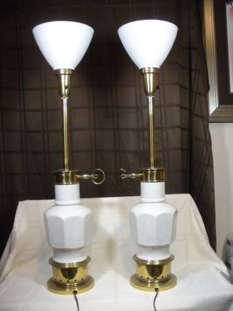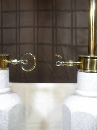 A pair of Mid-Century Hollywood Regency Style - Brass With White Crackle Glaze and White Glass Shade