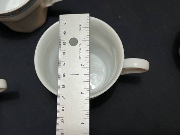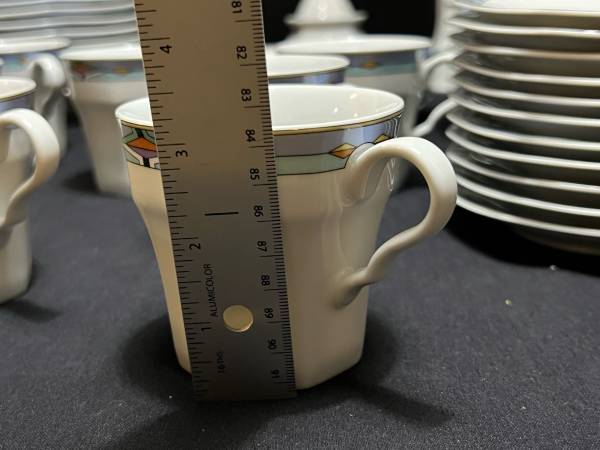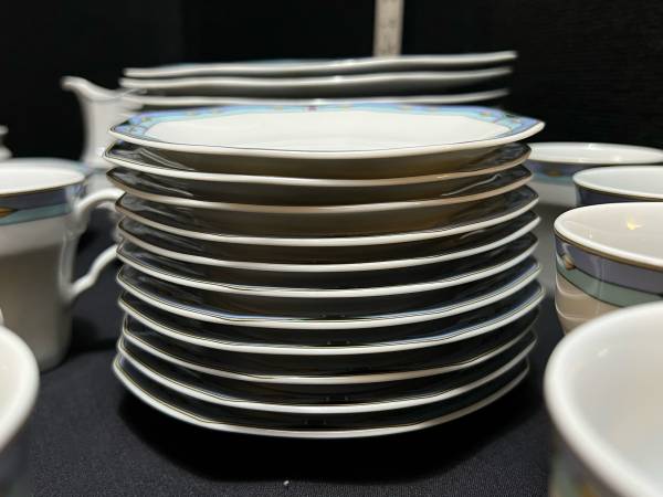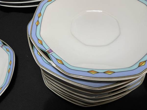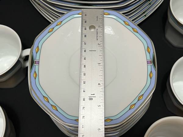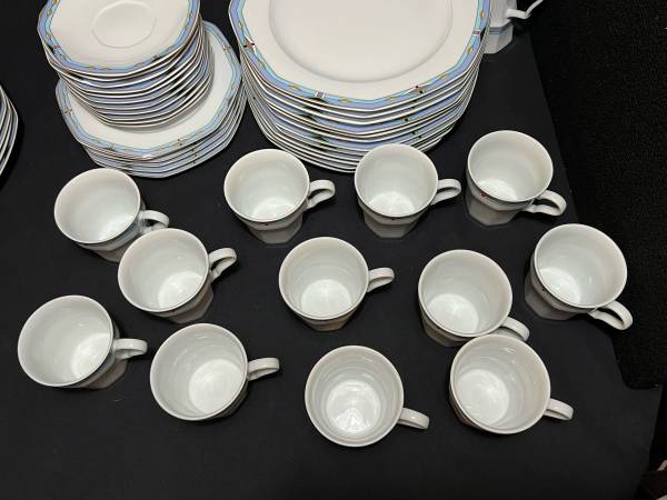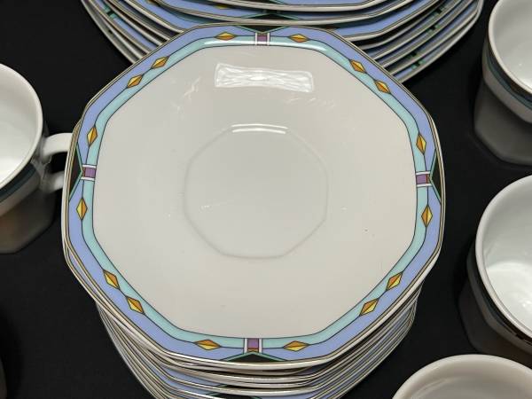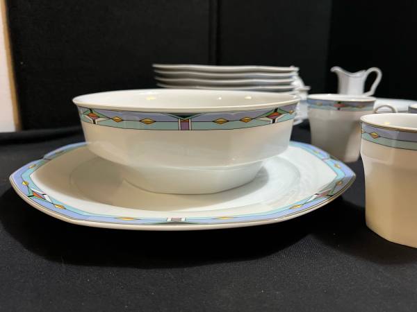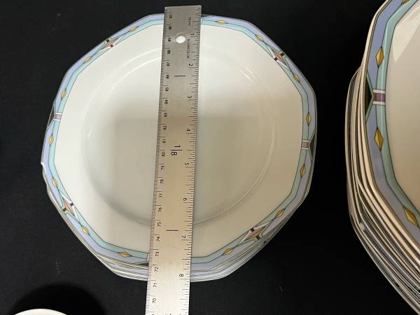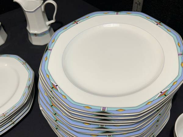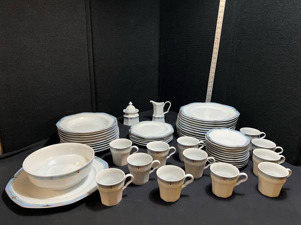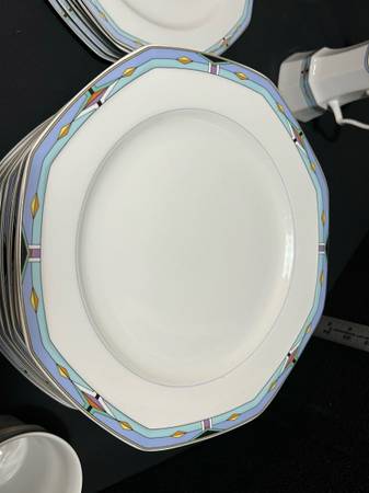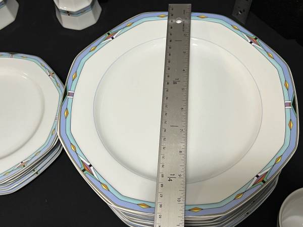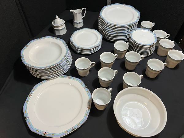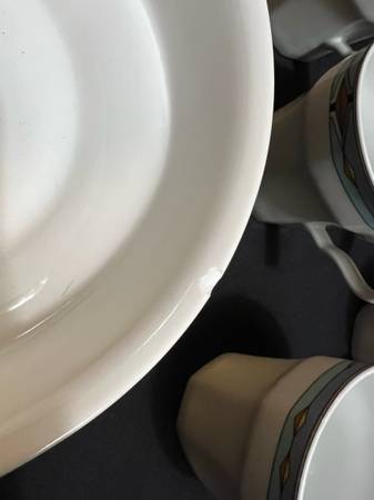 Hi, I have some Contempra by Studio Nova Dish Set White Center Blue Stripe Diamonds On Rim 55 Pieces for sale. They are still in good shape. The medium plates have been used the most and are faded. Some do have some dark marks. Some do have someone chips. There are several chips. The large serving bowl does have one too. It is a discounted pattern. Southwestern style.