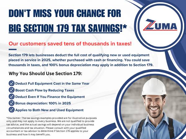 ⭐️Year-End Section 179 Tax Deduction Reminder: Place this machine in service by December 31, 2025 to potentially deduct up to the full purchase price from your 2025 business income. Financing qualifies, so you may deduct in 2025 even if you pay monthly. Open Cab $47,900 or Enclosed Cab + Heat $53,500; schedule delivery now so it is in service before year end. Bonus depreciation may apply on any remaining basis; ask your CPA for the best approach!*