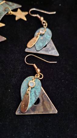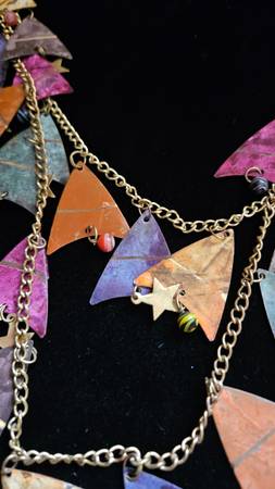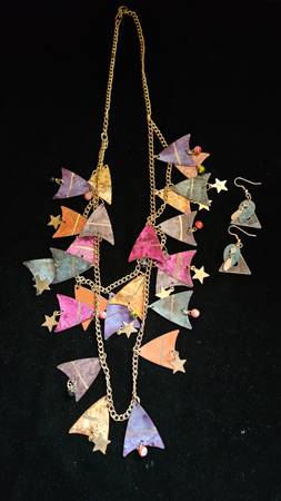 Multi-color BOHO metal and bead necklace and pierced earring set. The necklace is adjustable and is 15" at the longest. The dangle earrings hang about 1-3/4". This is vintage and a quite lovely set!...
