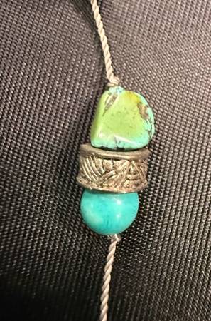 This chunky vintage necklace features 11 polished oval-shaped Howlite beads with small silver-toned spacer beads and blue glass beads on both sides. Between the large beads you will find Howlite nuggets and circular beads on either side of silver-toned barrel bead with a stamped pattern. All on a gray colored twisted cord.