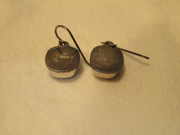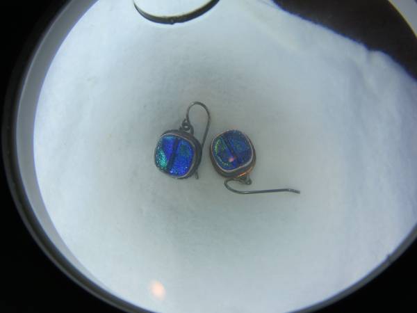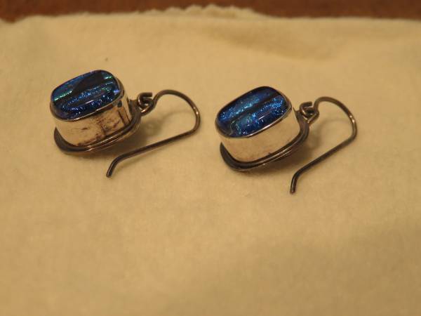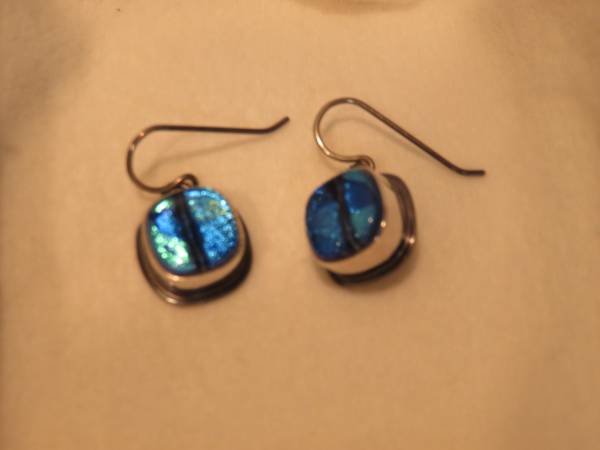 This listing is for one set of earrings made from fused glass. The encasement for the glass is Sterling Silver. These are hand-made earrings. They have a fish hook or ear wire back. These earring measure about 0.5 inches square (not including the hook) and are about 0.25 inches deep. One earring has the word “Sterling” etched on the back. They can use some polishing but are in excellent condition otherwise. Rarely worn and I don’t see any flaws on the earrings. These were purchased from an artisan store called Pismo in Denver (box and polishing cloth included). Please review all posted pictures. Pictures are of the actual item you will receive. Item comes from a smoke-free home. Feel free to ask me any questions.