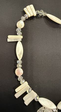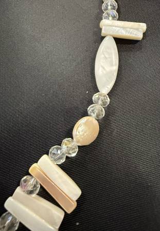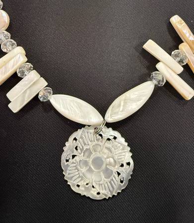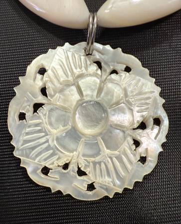 Mother of pearl beaded necklace. This vintage necklace features various shapes of mother of pearl and clear faceted glass beads and two faux pearls. Adorned with a large round mother of pearl pendant with a floral design carving.