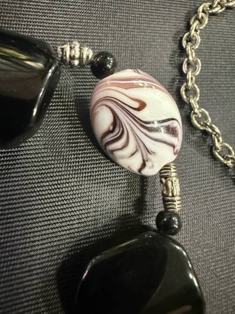 Chunky statement necklace with alternating black and white patterned beads on a silver-tone chain.
