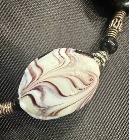 The white beads with multi-colored swirls appear to be lampwork glass beads