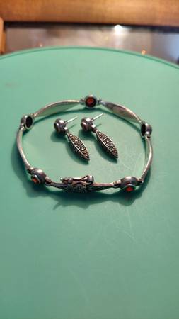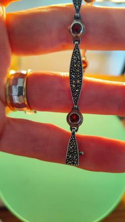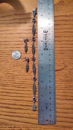2) .925 Sterling Silver Garnet and Silvery Marcasite Locking Clasp Bracelet + Dangle Drop Earrings Set - Nice! - $199 for the set