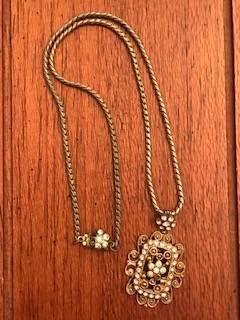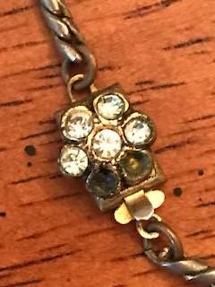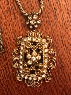 Vintage Rhinestone Necklace Unknown metal used ******3 Rhinestones are missing--SEE PICTURES Length of Necklace Chain: 8 1/2" Dimensions of Pendant: 1 3/4" x 1" $20.00 CASH ONLY NO SHIPPING
