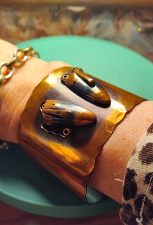 Vintage Wide Copper Cuff Bracelet with Faces - Patina - ca. 1950s
