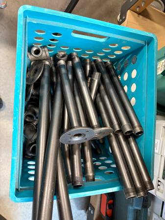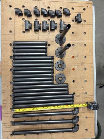 I have an assortment of steel pipes with fittings for sale. This is left over from a project. All the pipes have been painted with a dark metalic paint. Looks great