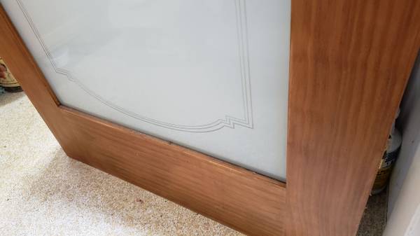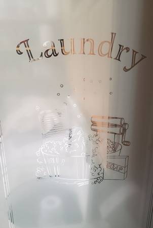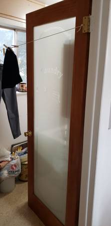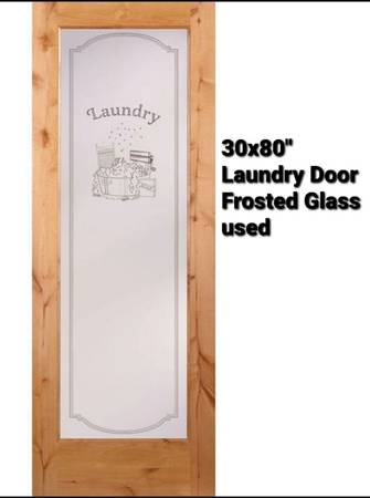 Selling solid wood Laundry door with frosted glass. Used condition, has door knob, no hindge sets. Measures 30x80" Email if interested