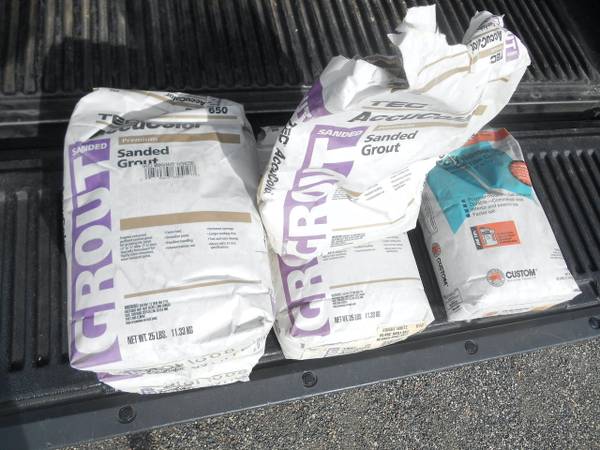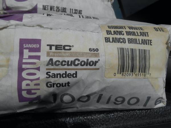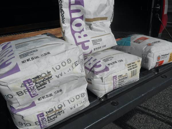 25 lb. bags of sanded grout for tile work, all have been stored dry and indoors, 2 different colors, please see photos of bag labels for specs, the bright white color I have 3 full unopened bags along with a partial bag and the natural gray color is one full unopened bag, full bags are priced alone at $10.00 or take all 3 of the white along with the partial for $25.00, call/ text Doug