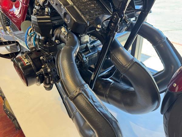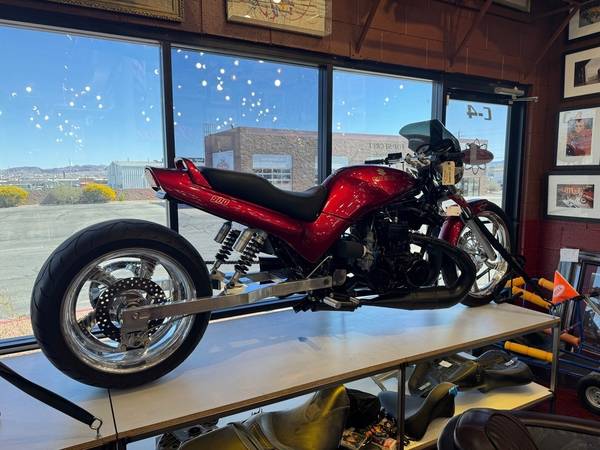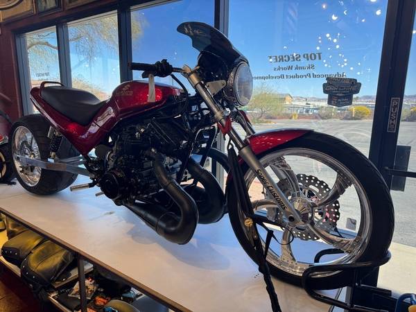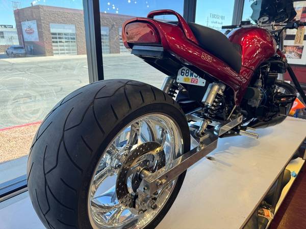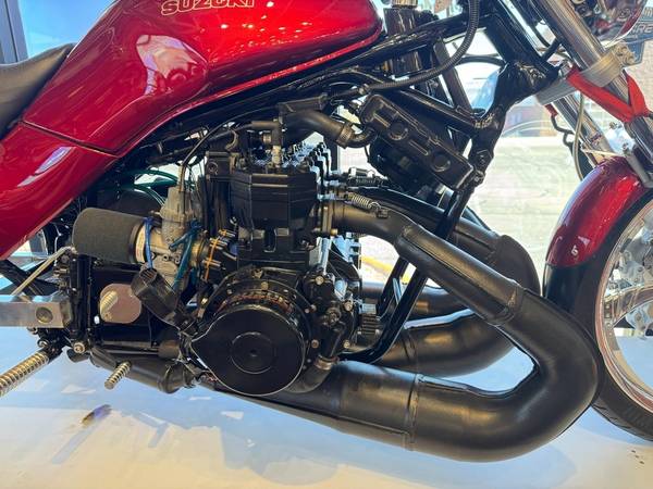 This 1990 Suzuki VX800 has a 1995 Arctic Cat Thundercat 900 snowmobile engine, Performance Machine wheels, and Arctic Cat CVT belt drive (snowmobile clutch). The Arctic Cat Thundercat 900 engine is a 900cc, triple-cylinder engine that produces 161.5 HP. The engine was manufactured by Suzuki.