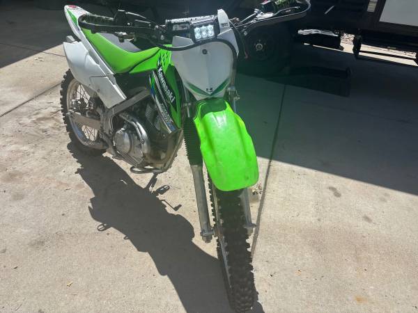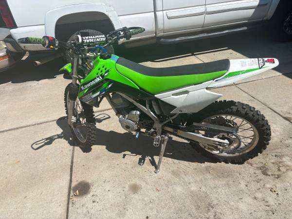 The 2013 Kawasaki KLX140L features a 144cc, SOHC, air-cooled four-stroke engine with a 5-speed transmission, front and rear disc brakes, a high-tensile steel perimeter frame, 19-inch front and 16-inch rear wheels, and electric start.