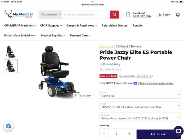 Jazzy Elite Power Chair. Power controller dynamic. 300 lbs capacity. Foot rest. Seat belt. Front anti-tip wheels. Includes power charger and product manuals. Has not been used or been outside. Purchased in 2020 for $4,100. Husband purchased thinking he may need it in the future, but did not. Near Kipling & Coal Mine, 80127.