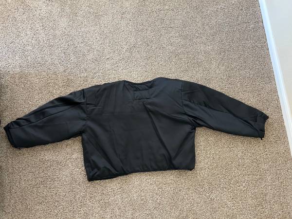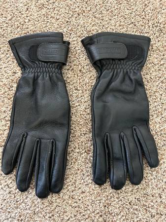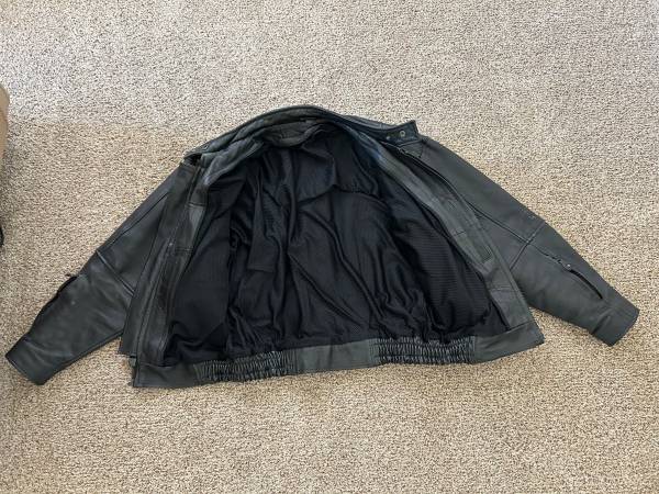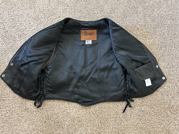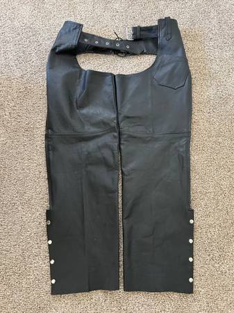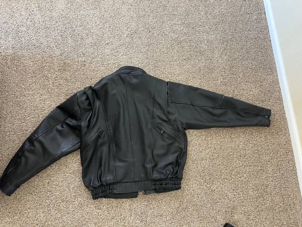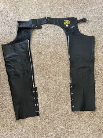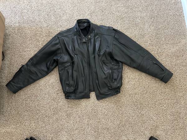 Ladies leather jacket size 14 With removable liner Two inside chest pockets Several vent zippers Collar to wrist 24” Shoulder to wrist 22” $15.00 Chaps Size XL, inseam 33” All snaps and zippers work...