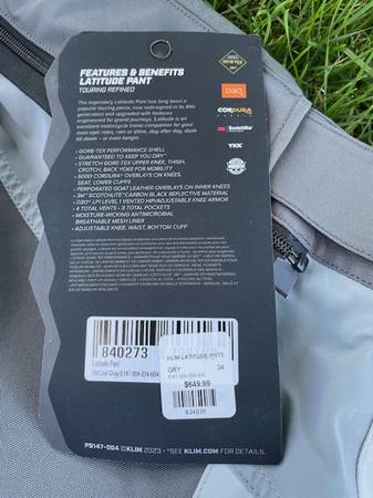KLIM Gore-Tex ADV riding gear in new condition. Jacket is size large and pants are 34 waist. I've ridden with them once. Slight discoloration on pants as shown on photos-there was an open ballpoint pen in my pocket that leaked a bit-barely noticeable. The color is not what I want, so I'm selling these at a discount to buy something different.