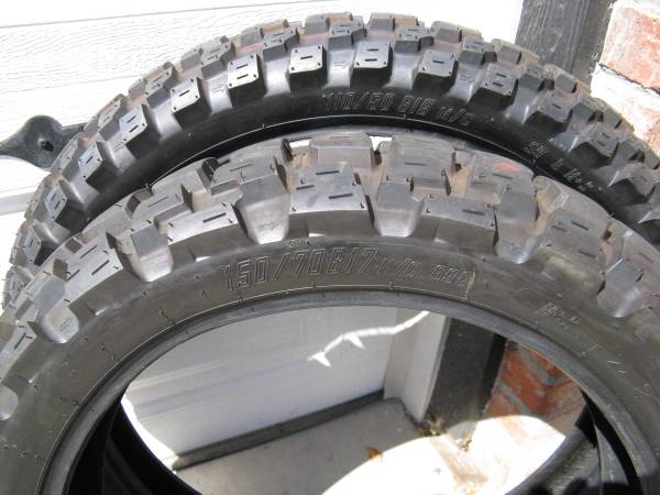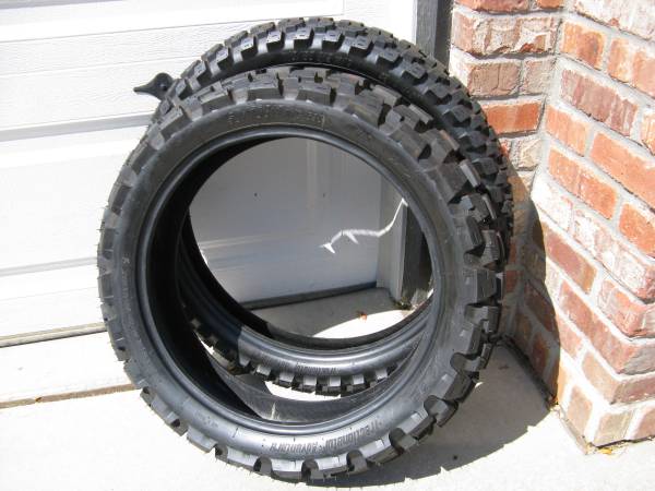 MotoZ Tractionator Adventure Tires 150/70-17, 110/80-19 Less than 300 miles. I bought bike (2012 R1200GS) this past spring and the owner had just had these tires install for the sale. I rode bike home to Lakewood form Longmont and had the tires changed to a more street type tire (Tourance). These tires are great for someone that takes their bike off-road, I do not. Great reviews and long-lasting tough tire. I know these tires will fit: Pre 2013 BMW R1200GS and GSA, R1150GS and GSA, All years Suzuki V-Strom DL650 and DL1000. Maybe other also? Asking $180 for the Pair (both tires). If add is still up, they are still for sale.