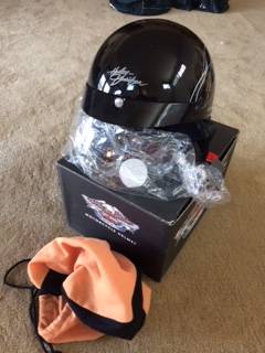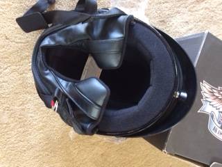THIS BEAUTUFUL BLACK HARLEY DAVIDSON "DESTINATION" HALF-HELMET HAS NEVER BEEN USED. SIZE SMALL (S), INCLUDING REMOVABLE EAR FLAPS AND OPTIONAL CLEAR VISOR. MADE BY HJC WITH SILVER PINSTRIP DESIGN....
