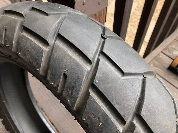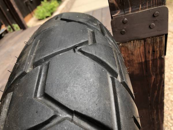 Tread depth is currently 5 mm down the very center of the tire. The tread depth on the very outside edge of the tread is 8mm. ( I believe this is the depth when new)