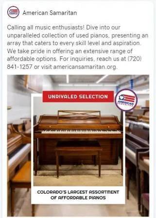 American Samaritan is a local non-profit organization that works to provide pianos, furniture and home decor at a low cost to families all along the front range range. Find us online and like us on Facebook
