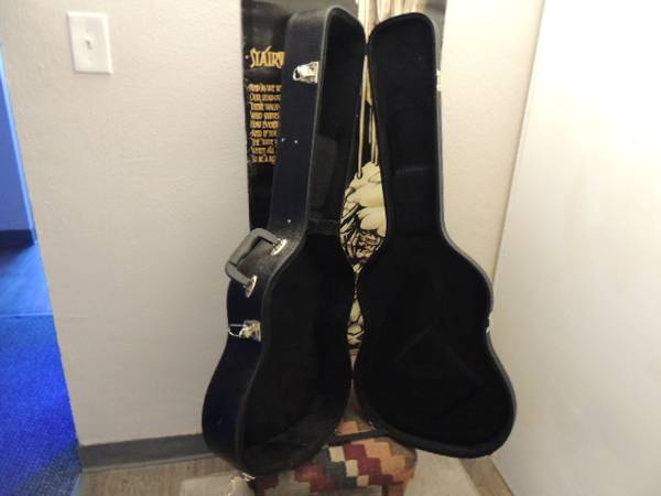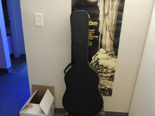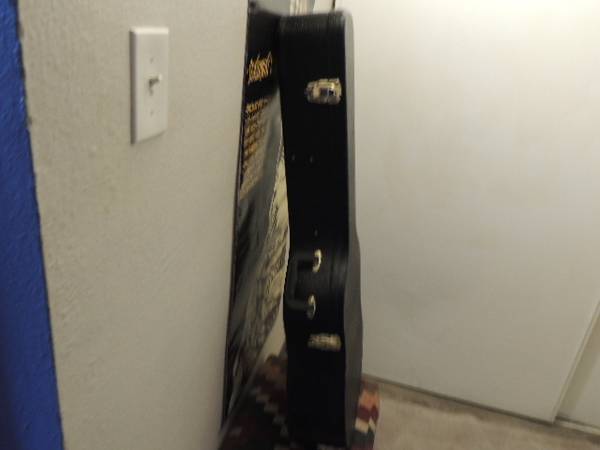 Classical guitar case. Keys for lock, Black shell, and black fury lining. $50. Lower bout: 14-7/8" Upper bout: 11-1/2" Waist: 10" Body Length: 19-3/4" Body Depth: 4" Total Length: 40"