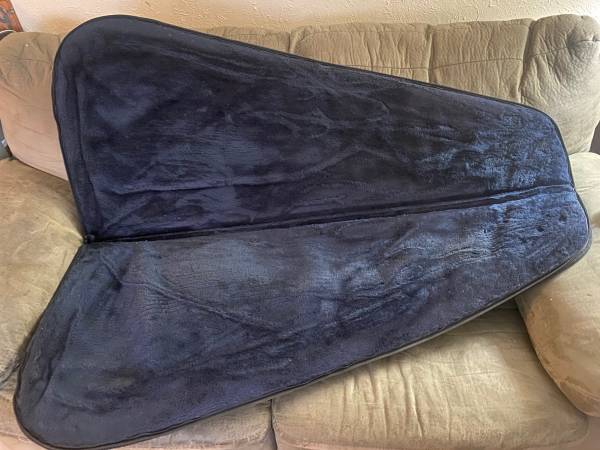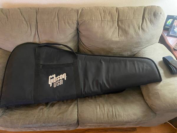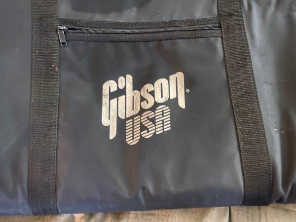 For sale is this lightly used Gibson USA padded soft guitar case. Outside measurements are 45 1/2 x 21“. It fits Les Paul and regular guitars nicely. As you can see in the photo yet may also accommodate some flying Vs. Inside measurements are more like 19 x 42 1/2 with a little bit of variance. All zippers and handles work fine. Good condition.