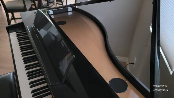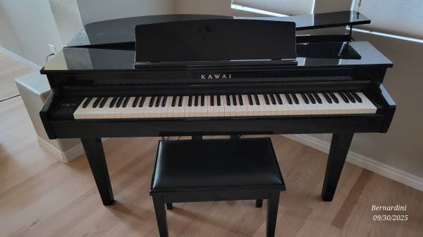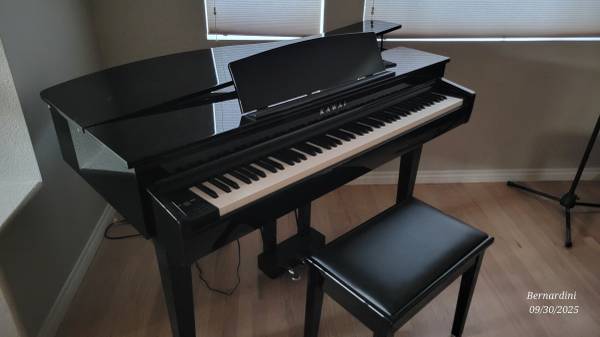 The Kawai DG30 is a digital grand piano featuring the Responsive Hammer III (RHIII) keyboard action with Ivory Touch key surfaces, a Progressive Harmonic Imaging (PHI) sound engine, and 355 voices. It includes a Grand Feel Pedal System, a 40W speaker system, and Bluetooth connectivity for audio and MIDI. Other specifications include a 256-note polyphony, a 128x64 pixel OLED display, and various connectivity options like USB and line in/out.