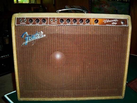 This amp has the exact same control panel as the '60 Bandmaster. The original 50 or so of these amps had anodized aluminum knobs. Here, we have the original brown bakelite knobs, as well as the logo badge and nickel hardware (not rusted!). Speaking of the knobs-- only the first Vibrasonics had the center VOL knob! Both VOL knobs are to the right of the BASS and TREBLE knobs-- a feature that did not last long (how many times did I attempt to turn up the volume but only got a "bass boost"!?) The Vibrasonic featured the “presence” control knob. What the heck is this, you ask? This boosted mids/highs (hence, “presence”) and has a special effect when amp is distorting. A very long 3-prong chord was added. New feet were added at some point. This amp has 2 Sovtek power tubes (6L6GC’s) that have spring holders. There are 5 12AX7 tubes, 2 of which are for the tremolo circuit. Amp is pretty loud for its power size, and the JBL really sings for certain kinds of music and sound. Inside I can see a couple newer capacitors, but most of the yellow Astrons are there. Also has original footswitch (sans bottom plastic). Checked out by NBS Electronics. Since the FIRST one of these had serial 00001, this one is the 98th one made—the oldest I’ve seen. The Vibrasonic was only made until 1964, so it is also rare from that standpoint. Lots of clean headroom, so the heavy-duty transformers from the 80watt showman were used. (This amp has same chassis as the Showman, with half the 626 tubes). The Vibrasonic featured a new “harmonic vibrato” tremolo system, that emulates true “pitch shifting” and is Leslie-esque! How this tremolo was designed is a fascinating study of its own! It was quite an innovation. This amp has a replacement special-order cover, and believe it or not, still has the original footswitch that operate the tremolo! These amps are loved by steel players, jazz players and quintessential for surf music sound (think Beach Boys). I'm thinking it would pair nice with that $40K 1960 Fender Stratocaster!