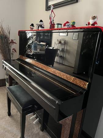 Petrof studio upright concert piano with bench. Exclusively imported. Mahogany wood. Superb tone, ultra-responsive touch and extraordinary performance. Only used a few times.