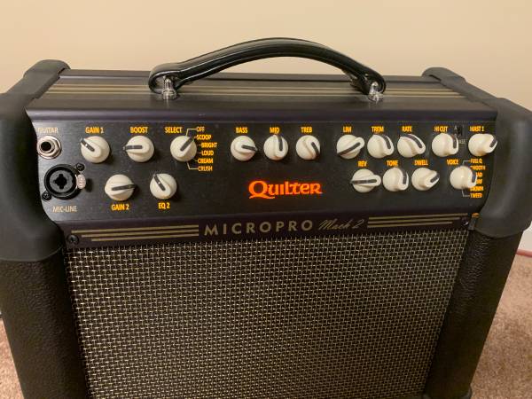 Quilter Micropro 2 amp in excellent condition with footswitch and cover. This is a 2-channel amp with a large pallet of sound possibilities. It has 3-band EQ, a lush reverb with tone control, limiter, excellent tremolo, high cut control, effects loop and DI for direct recording. Incredibly loud and full for its size, and very portable.