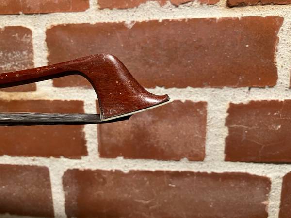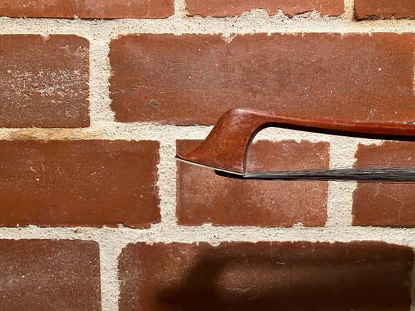 Old W.R. Schuster Bass Bow in German-style grip. For cello or upright bass. 139 grams. Pernambuco octagonal bow, ebony frog, metal winding, leather grip, silver ferule and pearl slide. Stamped makers mark. Excellent balance and straight. Well loved and played. Had it re-haired several years ago at Eggen Violins Shop. A greater than $1,000 bow going at a great price.