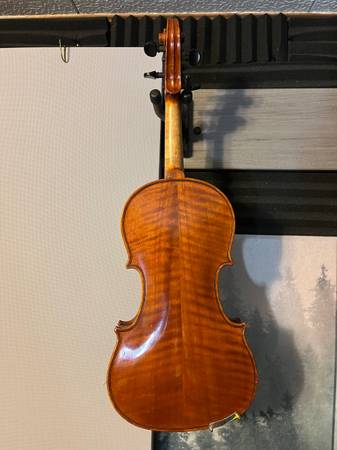 This violin is fully setup with a quality Aubert bridge with a parchment bridge protector on the E string notch. The instrument is fully worked-over and needs no types repairs. The tailpiece has been upgraded to a composite version with built in fine-tuners for a proper setup. Originally [shown in some of the photos and the one of the violin in the case] the violin had a standard tailpiece with external mount fine-tuners for every string; some people do this because it’s easy and it’s also a bad move as it negatively/detrimentally impacts the setup. The addition of a proper tailpiece for the violin made a huge difference in the intonation, projection and all around responsiveness of the strings.