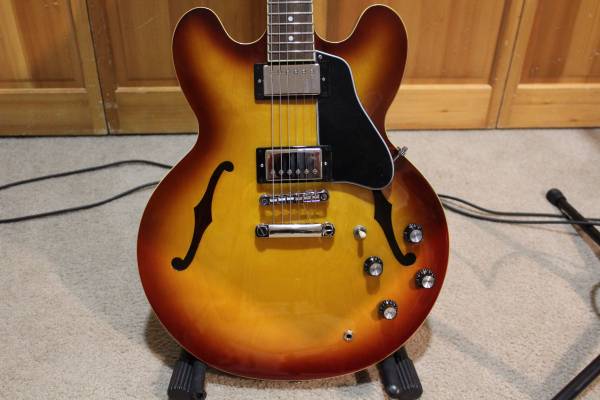 Just in to the shop; Inspired by Gibson is a semi-hollow electric guitar that offers the classic look and sound of the original Gibson ES-335 at a more affordable price. Really good sounding guitar 2 small dings on back but only surface not into wood. plays great and sounds real close to the Gibson 335. So if you need a road ready guitar in New condition, and Save $4k this is a great choice. Play one at the music store. Comes with the Epiphone Branded Hard Shell Case.