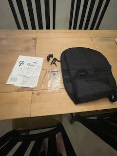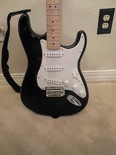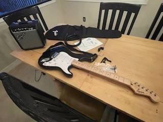 Lightly used, in great condition, Fender Stratocaster electric guitar. Includes the amp, the amp cord, a tuner, a capo, and carrying case. Original paperwork included.