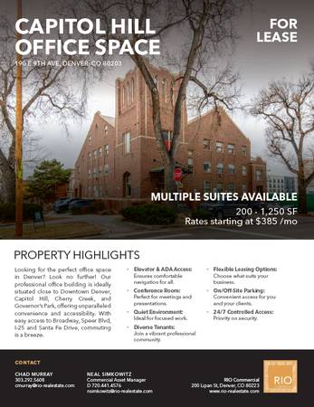 Discover your ideal workspace in a prestigious professional office building, conveniently situated near Downtown Denver, Capitol Hill, Cherry Creek, and Governor's Park. This serene environment is home to a diverse range of professionals, including therapists, counselors, accountants, lawyers, photographers, and a wide range of general office users.