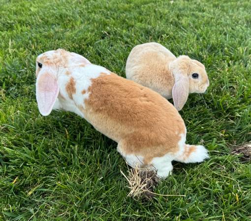Mini Plush Lop unrelated breeding pair. Not mixed with holland lops. Comes with pedigrees. 1 yr old Male is proven, Female is reached to breeding age. ** VM Harlequin Male: 3.1 lbs, he is proven,...