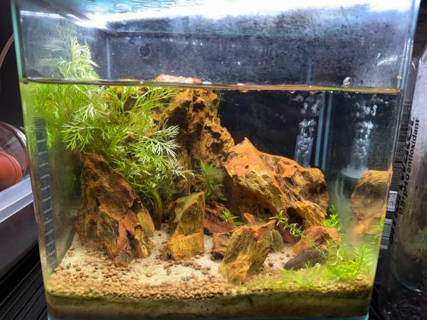 3 gallon cube with a lid, light, 2 stage bubble filter, aqua soil, sand, rocks & plants. There are only a couple bladder snails in the tank right now. Text me for more info, thanks!
