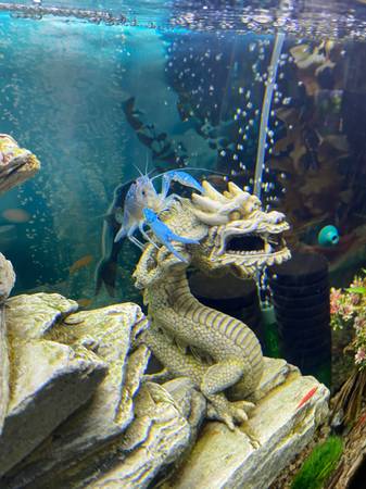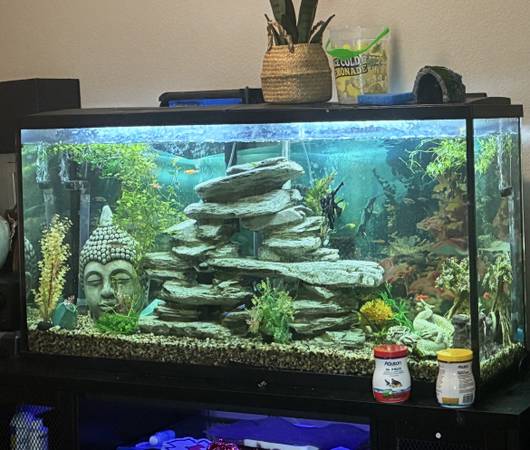 55 gallon fish tank with LED stand. Community of fish. Substrate gravel. Under gravel filters, bubble filters and regular filter. Live plants, decorations and chemicals all included. The stand has LED lights, usb and 12v plug ins. The stand alone was $180. It’s 6 months old. Angel fish, Pleco, varieties of tetras, 2 electric blue crawfish and more. Shoot me an offer. Asking $350