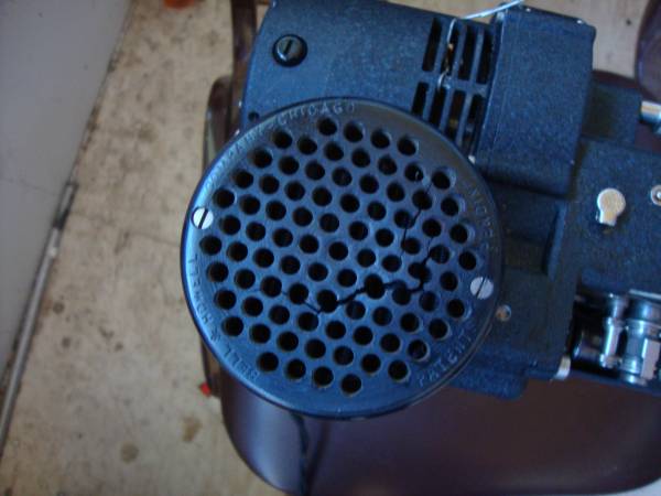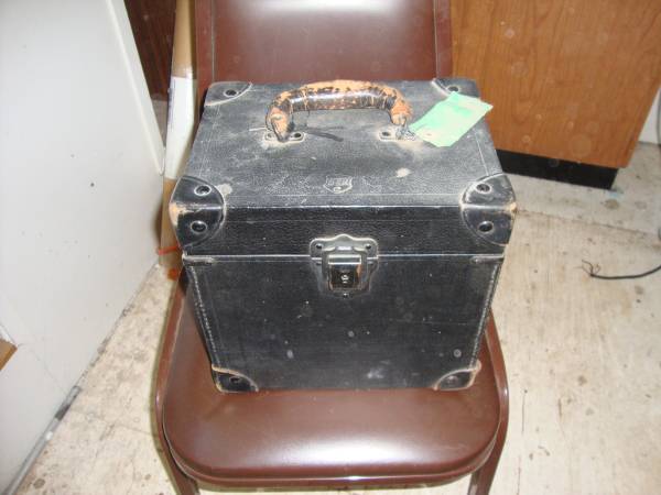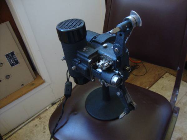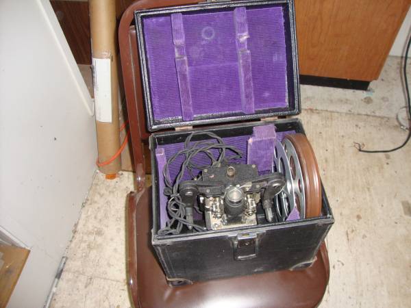 This projector is in good working condition and good shape. The exhaust cover is cracked but still functional. It has the original electric cord and includes the original operating manual, which is tattered but readable. The outer case is in fair condition, although the handle is well worn. Will include a take-up reel and an unknown movie reel.