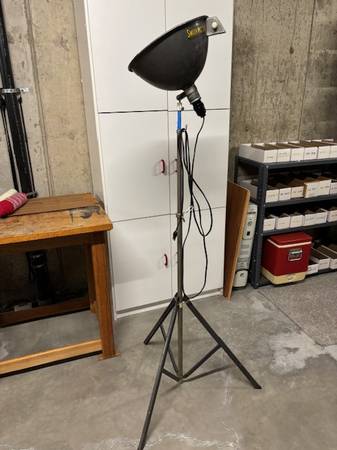 A set of three vintage photography lights and stand, made by Smith Victor in the 1950s. 250-300 watt bulbs. New bulb needed for one of the lamps. All lamps work well. Set also includes one tripod stand and one clamp for securing lamps to the stand. Some scratches in the paint and minor dents are present on the lamps.