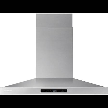 DESCRIPTION: Samsung 36" wall-mounted chimney style, range hood features 600 CFM, 3 fan speeds including booster, digital touch controls and baffle filter.