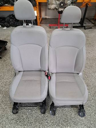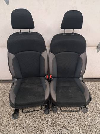 #9--1 Pair of front seats from a 2015 Forester, the seats are gray in color and are cloth material. Both seats are in good condition with no seam separation or bolster wear. The drivers seat has power adjustments and the passenger has manual adjustments both seats are heated.