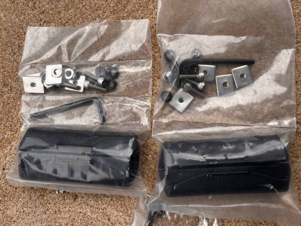 New, never installed set of (4) Skyline towers, SL crossbar adapters, Landing Pad LP1, dust covers, locks and key. As configured, the towers are ready to mount to Yakima aero or HD crossbars (not included). Landing Pads include Yakima size "A" track plates which fit most roof tracks. These mount to factory or aftermarket vehicle, topper, camper, cap, bed cover or camper shell roof tracks.