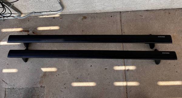 Excellent condition set of (4) Baseline towers and 50" Jetstream crossbars. Locks and key included. The Baseline tower system is for naked vehicle roofs, and they work with Yakima's Baseclips (not included) which vary depending on your vehicle. Visit this site to see what Baseclips will work for you: