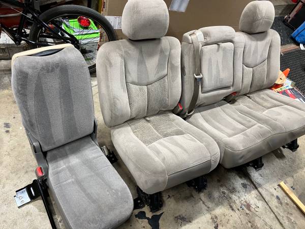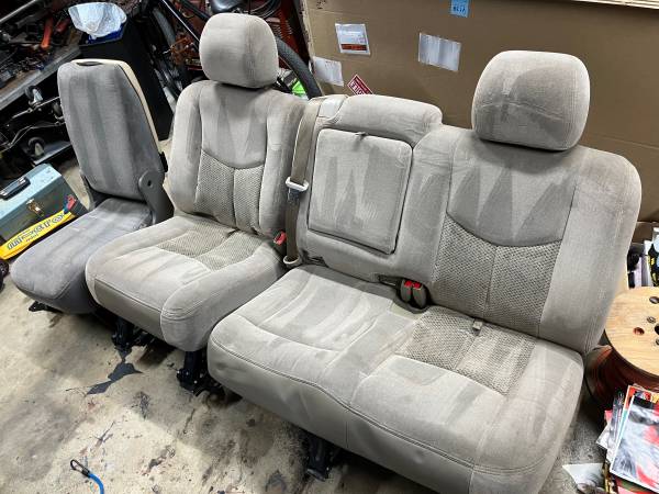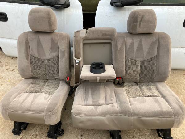 Selling second row light tan seats from a 2005 chevy Tahoe. Great shape for age ready to bolt in. Great replacements if yours are ripped, stained or missing. These seats would also work in an old truck or rat rod. Gray center console is also for sale separately. These items for others years and models